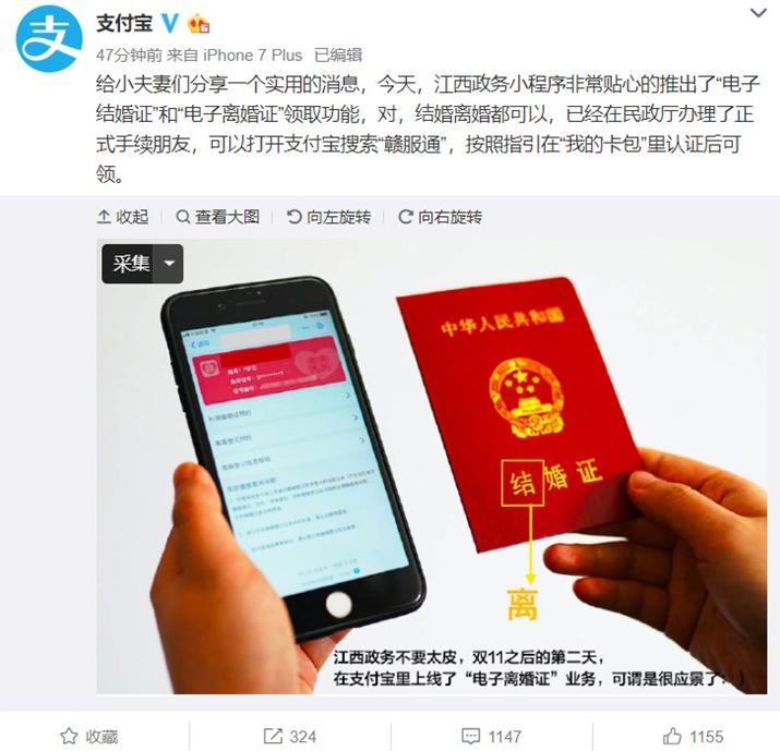 支付宝上线全国首张电子离婚证,江西人办事“一次不用跑”。听说过“最多跑一次”,你知道江西人“一次都不用跑”了吗?