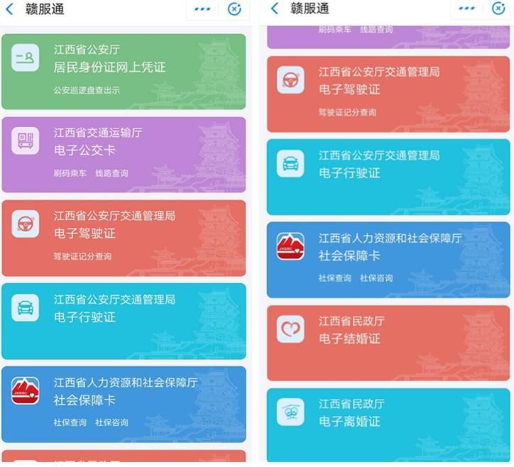 驶证、电子行驶证、社会保障卡、电子结婚证、电子离婚证。值得注意的是,“赣服通”的电子离婚证是全